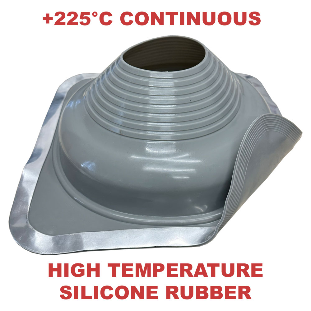 Silicone rubber has a MUCH higher temperature resistance then EPDM rubber. Our silicone pipe flashings can be used from -50 to +225 Degrees C, and up to 260 Degrees C intermittently. It is recommended to use silicone pipe flashings for wood burning and multi fuel stove installations.